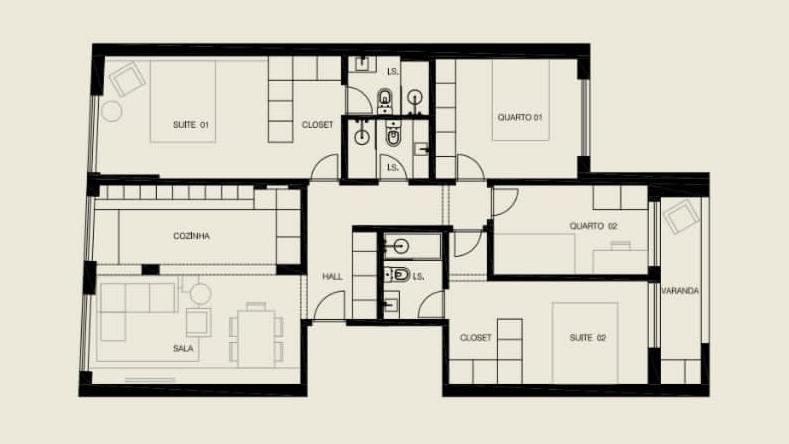 O Imóvel possui quatro quartos, sendo dois deles suites com closet. Conta ainda com dois quartos, equipados com roupeiros.